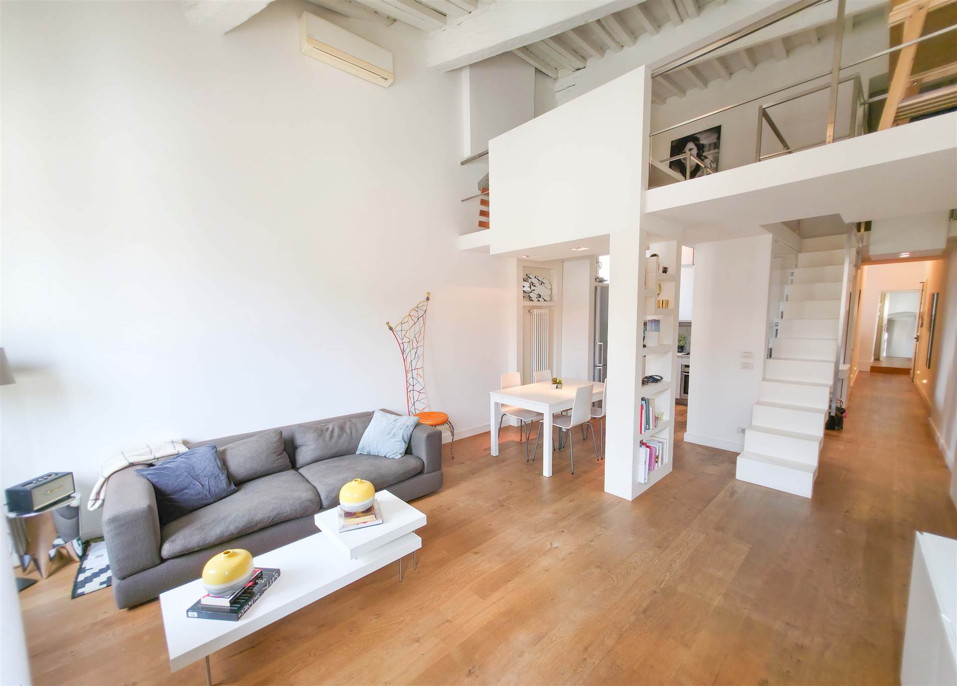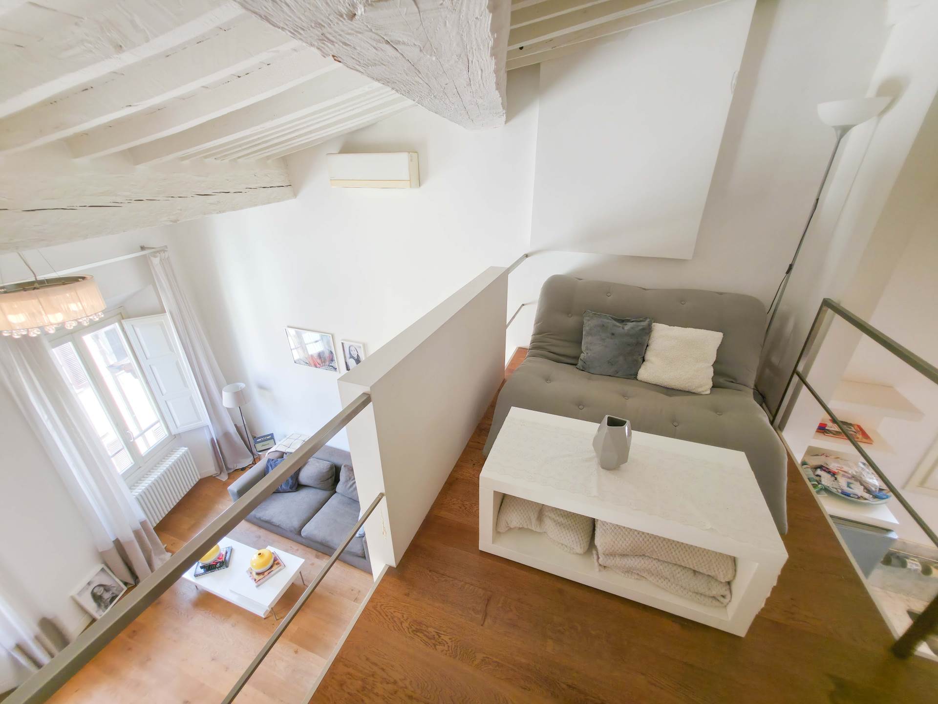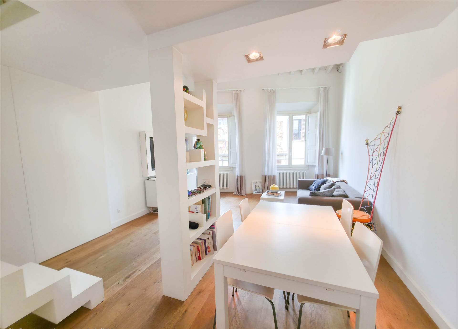 L’immobile è composto da ingresso, soggiorno con angolo cottura ed area pranzo e doppie finestre con affacci su via Maggio. Ampia camera matrimoniale con vista su Palazzo Pitti, due bagni di cui uno con grande doccia, e ripostiglio. Nel soppalco di arredo si trova uno studio che si apre sulla zona giorno, una camera singola oltre a piccola stanza adibita guardaroba.
