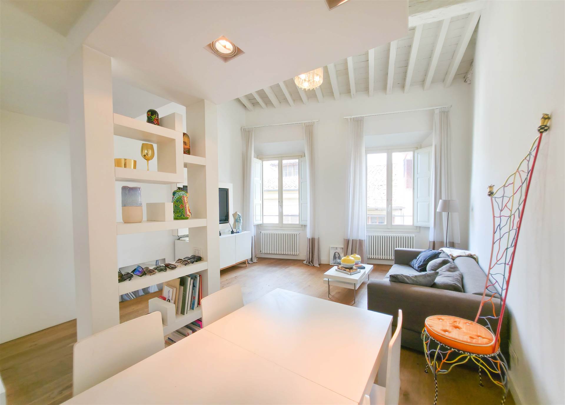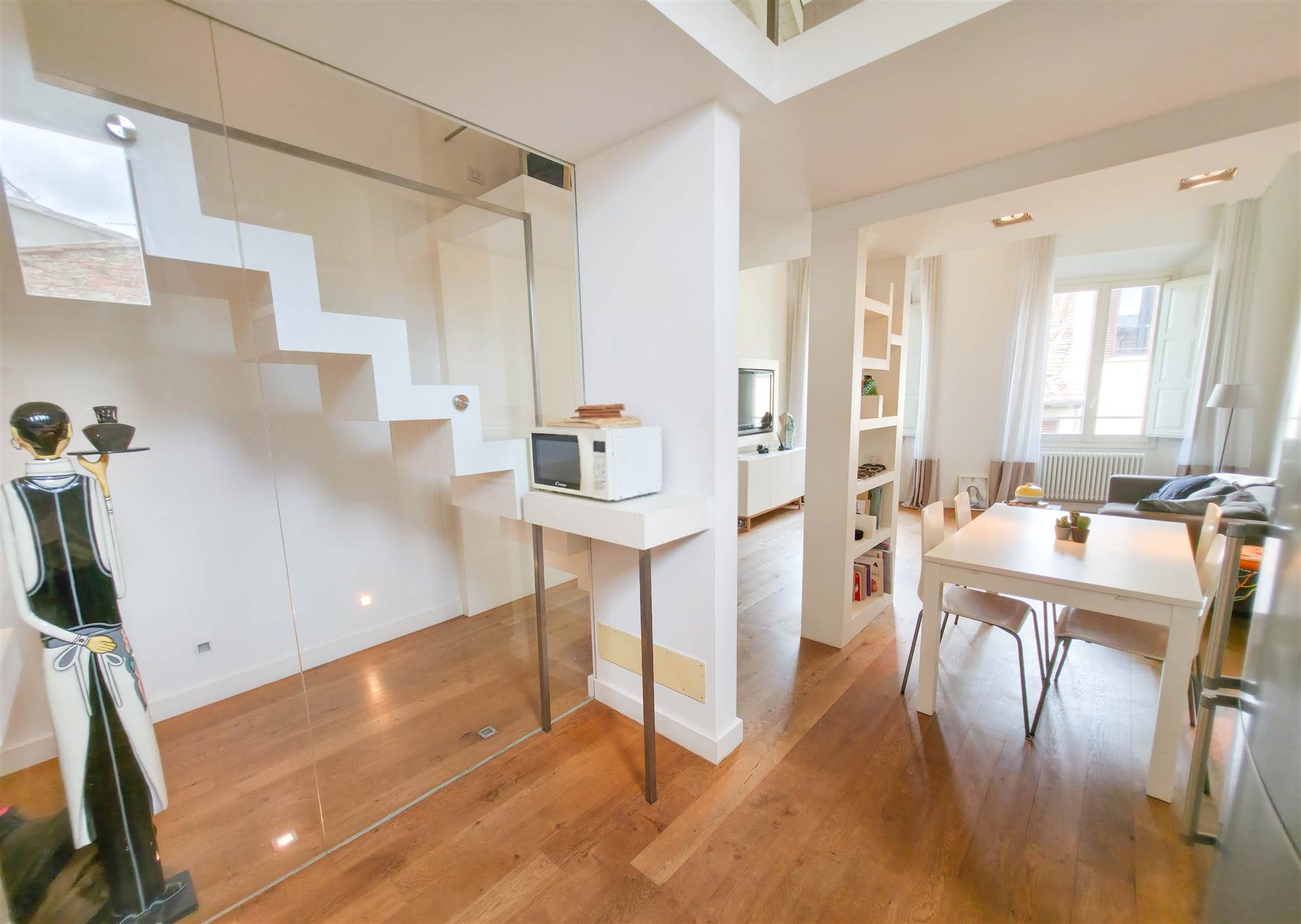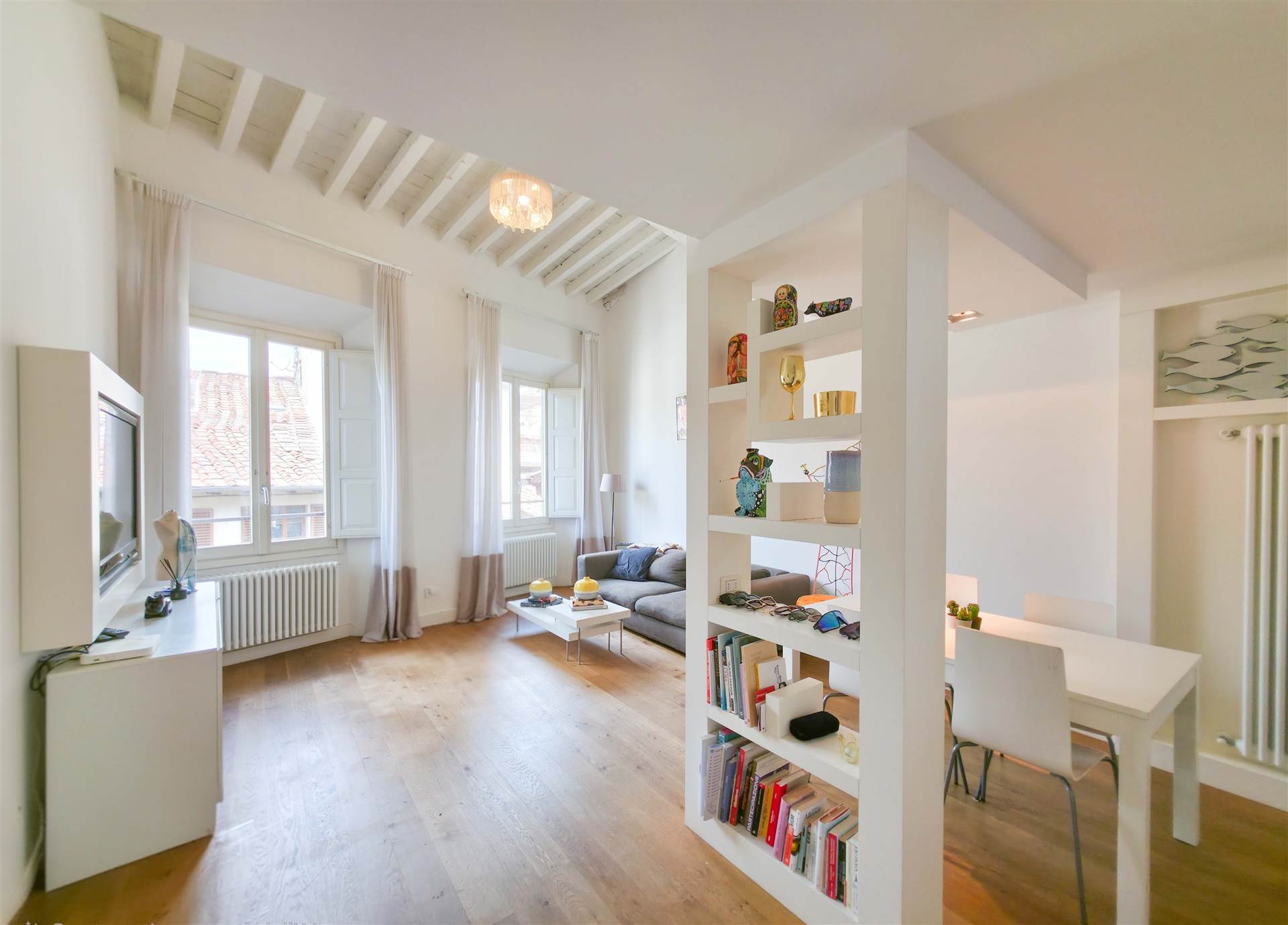L’immobile è composto da ingresso, soggiorno con angolo cottura ed area pranzo e doppie finestre con affacci su via Maggio. Ampia camera matrimoniale con vista su Palazzo Pitti, due bagni di cui uno con grande doccia, e ripostiglio. Nel soppalco di arredo si trova uno studio che si apre sulla zona giorno, una camera singola oltre a piccola stanza adibita guardaroba.